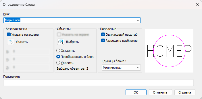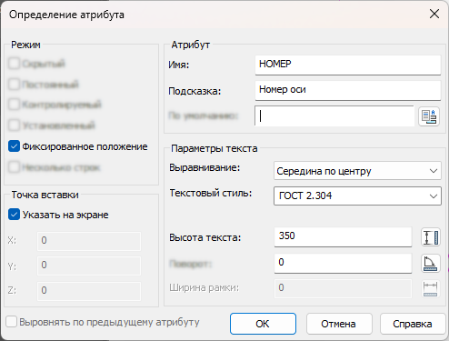 Введите имя «Марка оси», выделите окружность и атрибут (номер), укажите точку вставки в месте контакта оси с окружностью (верхний квадрант).